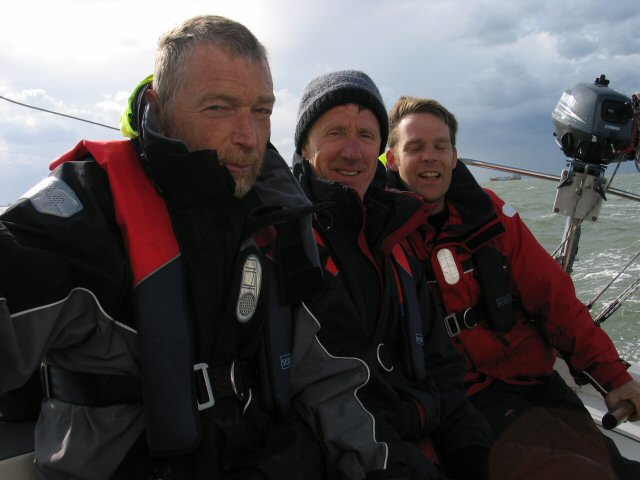 It was at the entrance to Foulgers Gat that we had a fright. I gave a course to Phil who was on helm at the time. Soon, the safe water marker buoy appeared, 3 miles distant and dead ahead. We continued on our course. As we neared it Phil asked what side should we pass, from the chart table I replied "either side but keep it close" and then gave him the new course to steer. I came up on deck, conditions were gentle, the sun was out and the two Keiths were chatting on the foredeck. Suddenly the depth alarm went off (2.5m). "Prepare to TAAACK", I shouted but it was too late, we gently came to a halt, so gently that it was barely noticeable. Phil and one of the Keith's quickly latched on to what had happened - we'd run aground on an ebbing tide. The three of us were running around, starting the engine and shifting our weight to one end of the boat. With the boat in full reverse there was no movement and my heart sank as the rudder began to touch bottom. However we did manage to pivot the boat enough on its keel to get the wind more abeam. The extra sideways force on the sails healed us over enough to allow the engine on full throttle to allow us to move slowly forward and to one side. We were off. The depth sounder was still bleeping but beginning to show ever greater depths but still less than three metres.