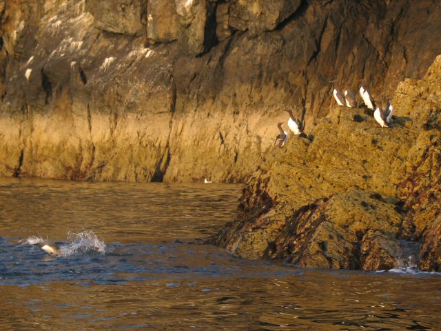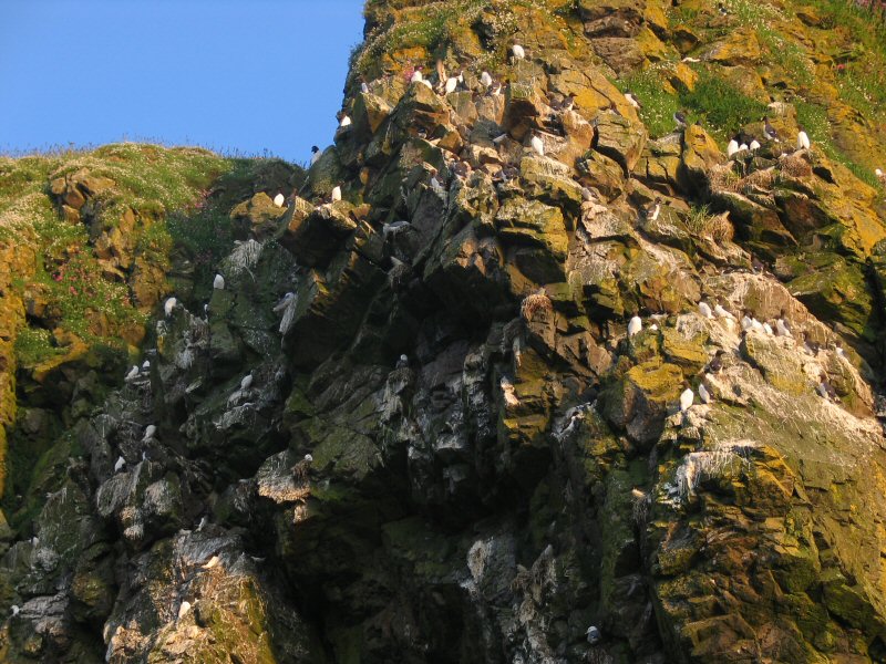 It certainly was a interesting place to be. You couldn't describe it as tranquil because of the noise of the birds. We sat and watched, fascinated at the numbers and the activity. The air was full of them: Puffins, Razorbills, Guillemots, Shags, Sheerwaters, Gulls and many others. It seemed a joke now that I'd never seen a Puffin. Eventually we opened a bottle of wine and cooked a fine meal before attempting an excursion ashore in the dingy. We had just got to the landing stage when the ferry boat returned with some sight-seerers. The ferry pootled on over to us and told us the island was 'closed' until 10 o'clock tomorrow - "to give the birds a rest". That was fair enough, they needed it.