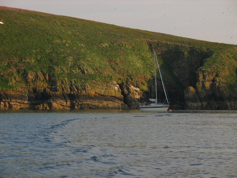 Wednesday 07 June 2006 Skomer Island is a marine nature reserve and bird sanctuary situated a few miles off the west Pembrokeshire coast. There are two exposed anchorages; one open to the north west and the swells from Brides Bay, the other open to the south west and swells from the Atlantic. Therefore one has to be very lucky to have conditions that allow for a trouble free night at Skomer Island. We were lucky. The fine weather and smooth seas we were currently experiencing meant either anchorage was possible.