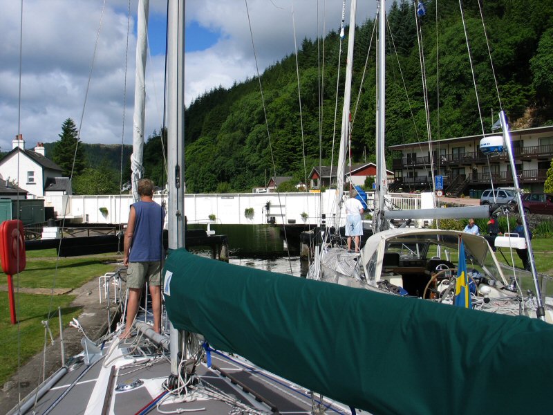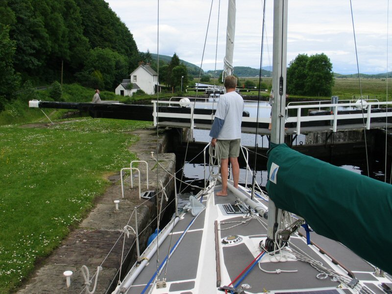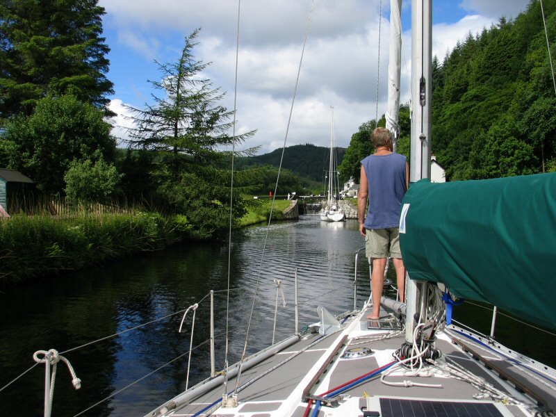 Despite the fine weather, the beautiful scenery; despite the company of a friendly Swedish boat; despite Ben's herculean efforts and Keith's work on the bow - by the time we had reached Crinan I'd had a bad day of it all. I was feeling a little down. My handling of the boat had not been good. The manoeuvring in tight spaces had made me uneasy, still in good temper but a little edgy. While dropping ben off on the quay side I had reversed away and stopped the boat a few metres from the quay, then intending to give full reverse throttle with full rudder to shunt the stern around I instead gave full throttle ahead - we touched the dock with a nudge that made the halyards slap. I was looking backwards at the time - expecting that to be the direction in which we would move. No damage to us (or the dock) but it was a blow to my confidence. It was the last lock - there was no more manoeuvring and no chance to end the day's journey on a good point.