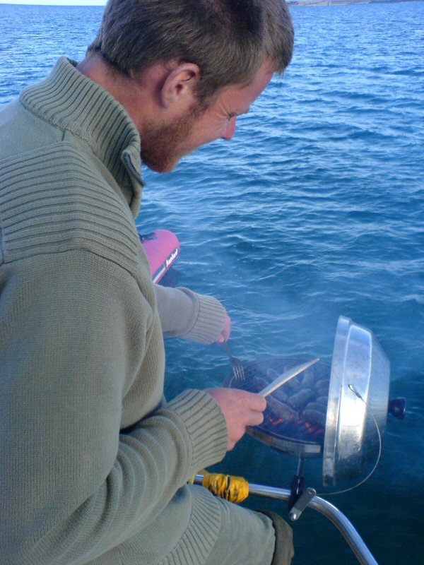 on the boat in the evening we cooked up a feast of barbequed sausages,