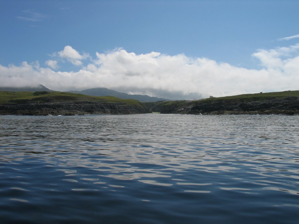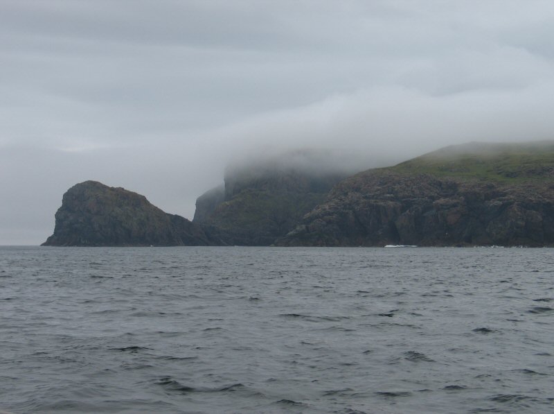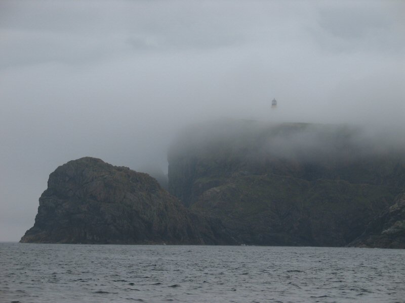 We left at 1020. The drizzle had turned into patches of wet fog, obscuring the land for long lengths of time. I hoped we would actually see the cape. It would be a sad thing having made it all this way only to go round the cape and not actually lay our eyes upon it! With a little time I became optimistic, the fog began shy away from the sea and hover over the land. The coast was visible on occasion and we plotted a course toward the cape inside of Am Balg; a large lump of rock some 44m high and just over a mile offshore.